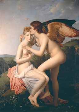Pověst vypráví o princezně Psyché, která byla velmi krásná.Lidé se o ní domnívali,že je krásnějsí než sama bohyně krásy Afrodita,což se samozřejmě Afroditě nelíbilo. Proto zavolala syna Erose, aby Psyché zasáhl šípem, aby jí šíp nepřinesl lásku a štěstí, ale neštěstí a starosti. Eros poslechl a rozletěl se za Psyché. Když jí ale spatřil, okamžitě se do ní zamiloval a poprvé svoji matku neposlechl. Psyché nebyla štastná,protože její sestry se vdaly a odešly se svými manželi do jejich zemí a ona jediná zůstala sama. Všiml si toho i její otec král . Proto se jednoho dne vydal do věštírny, aby s etam poradil. Ve věštírně mu poradili, aby Psyché oblékl do černého roucha a odvedl ji na skály za městem. Tam si pro ni přijde její manžel, který není z lidskéo rodu a dovede prý hrozné věci. Král se sice zhrozil, ale bál se odporovat bohům, proto vystrojil smuteční obřad a všichni lidé Psyché dovedli k vrcholku, odkud ji snesl vítr .Když se Psyché vzpamatovala, spatřila krásný zámek. Odvážila se do něj vstoupit a uviděla tolik bohatství, jako nikdy v životě. Najednou na ni začal mluvit příjemný hlas. Hlas se jí představil jako její manžel, oznámil jí, že vše kolem je její a všechno jí vyplní, al enikdy ho nespatří a povídat si mohou jenom večer. Tak si Psyché večer povídala se svým manželem. Jednoho dne se manžel vrátil domů, ale jeho hlas mluvil smutně. Zítra přijdou na skálu tvoje sestry, budou tě volat a naříkat, ty jim, ale nesmíš odpovědět. Prosila Psyché manžela, aby si sestry mohla pozvat. Druhý den opravdu sestry přišly, začaly bědovat. Psyché obě sestry pozvala do svého paláce, obdarovala je drahokamy. Sestry Psyché velmi záviděly a chtěly vidět jejího muže. Psyché se vymlouvala a raději sestry poslala domů. To sestry neodradilo a přišly zase. Sestry vymyslely lest. Když opět přisly a předstíraly smutek a řekly Psyché konec věštby, kterou si vymyslely. Řekly Psyché, že její muž je obludný drak. Toho se Psyché lekla. Sestry jí poradily, aby si schovala světlo a nůž a až drak usně, aby si na něj posvítila a uřízla mu hlavu. Psyché sestry poslechla. Když se její muž vrátil a usnul, vytáhla svíčku,posvítila a zjistila, že její muž je Afroditin krásný syn Eros. V překvapení jí ukáplo trochu vosku, který Erose probudil, zvedl se a odletěl pryč. Marně se snažile Psyché zavolat ho zpět, proto se ho vydala hledat. Na zenmi jí hledaly služky Afrodity, která je pověřila,aby Psyché našly. Psyché se ani moc nebránila a doufala, ze se u Afrodity setká se svým manželem. Jak jí dovedly k Afroditě, ta se na ní zle podívala. Sdělila jí, že Eros má velkou horeku a že ho před ní ukryla. Dala jí úkol. Musela přebrat hromadu s pšenicí, boby, hrachem mákem, ječmenem a prosem. Věděla, že to nemůže splnit. Najednou kolem běžel mravenec, zavolal svoje kamarády a hromady spolu přebrali. Když se Afrodita vrátila a viděla, že Psyché svůj úkol splnila, dala jí další. Měla sebrat chomáče ovčí vlny. Psyché se hned hnala na louku, aby mohla chomáče posbírat. Nad Psyché se smiloval rákos. Poradil Psyché, aby na louku šla až po poledni, když ovce spí, protože ráno by ji roztrhaly svými rohy. Počkala tedy až ovce usnou a posbírala chomáče vlny a pospíchala za Afroditou. Po splnění úkolu k ní Afrodita cítila jěště větší nenávist a dala Psyché další úkol, ale i ten s pomocí orla Psyché zvládla. jěště poručila Psyché, aby jí přiněsla vzácný lék od Persefony, která vládla podsvětí. Psyché věděla, že do říše mrtvých mohou jenom mrtví. Proto se rozhodla, že vyleze ne věž, skočí dolů a Smrt si jí odvede do podsvětí. Nyní se nad Psyché slitovala kamenná zeď a poradila jí co všechno má udělat, aby se dostala do podsvětí,ale i ven. Vše se podařilo a Psyché pospíchala k Afroditě. Jěště se chtěla podívat na mast, nadzvedla víčko a vylil se spánek smrti a Psyché okamžitě spadla k zemi mrtvá. Tou dobou již ji hledal Eros a konečně ji našel mrtvou. Sklonil se k Psyché, sejmul jí spánek z víček, rychle letěl zpět k matce,aby tam byl dřív než Psyché.Když Psyché dorazila začal Eros i s pomocí Zeuse přemlouvat svoji matku,aby Psyché odpustila. Afrodita se nechala uprosit a na Olympu se konala svatba. Zeus nechal vypít Psyché pohár nesrmtelnosti, aby mohla s Erosem zůstat navždy.